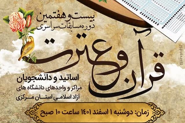 به گزارش ایکنا، واحد الکترونیک دانشگاه آزاد اسلامی همگام با سایر واحدهای دانشگاهی و در راستای گسترش فرهنگ قرآن و اهل بیت و عمل به حدیث شریف ثقلین در بین دانشگاهیان اقدام به برگزاری بیست و هفتمین دوره مسابقات قرآن و عترت کرده است.