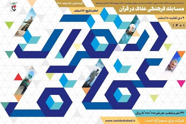 به گزارش ایکنا، سومین مسابقه فرهنگی و قرآنی «عفاف و قرآن» همزمان با سومین سالگرد شهادت سردار شهید حاج «قاسم سلیمانی» و چهلوچهارمین سالگرد پیروزی انقلاب اسلامی از سوی اداره مراکز فرهنگی و علوم قرآنی اداره کل امور فرهنگی و تبلیغات بنیاد شهید و امور ایثارگران آغاز شده و در حال برگزاری است.