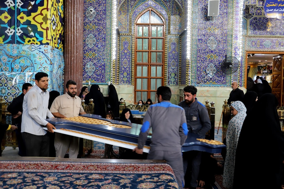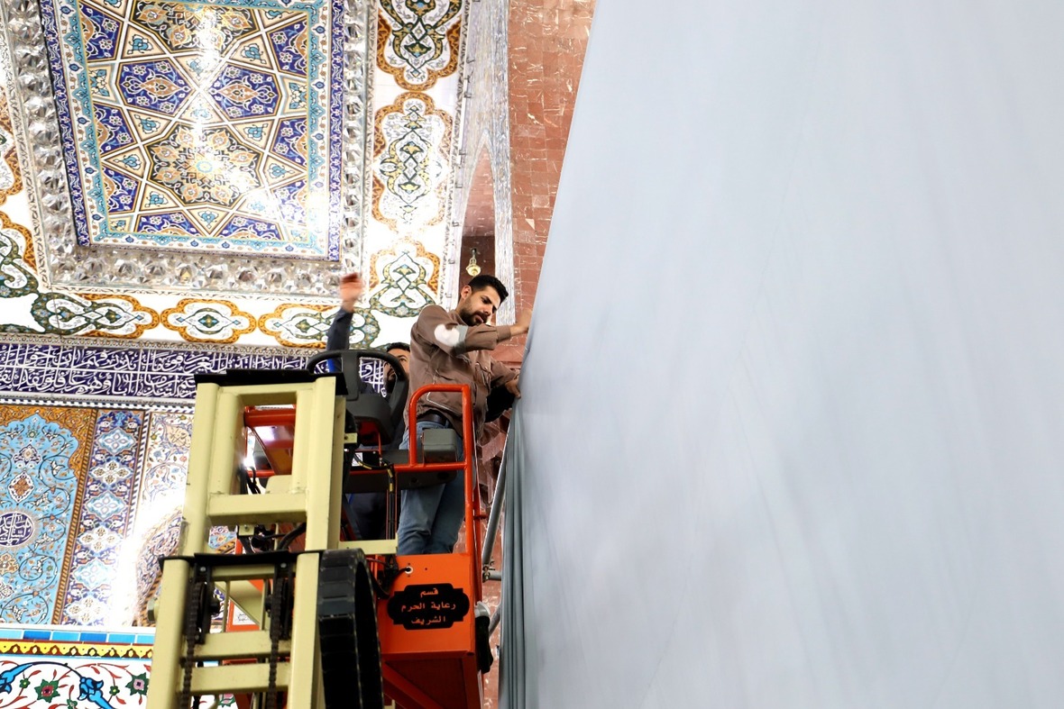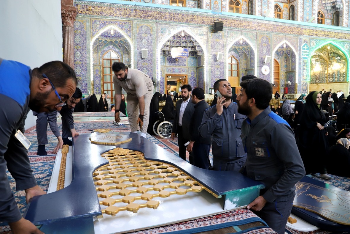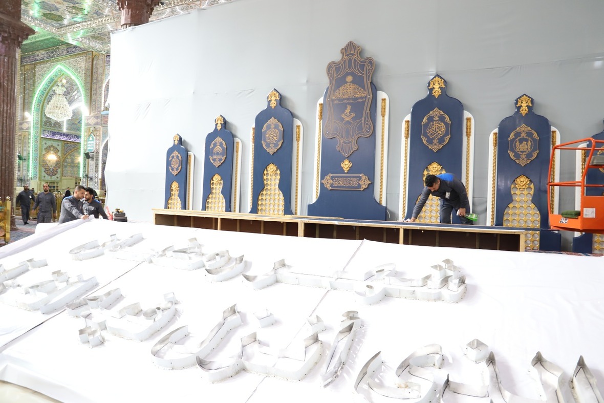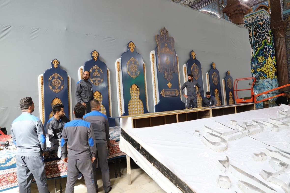 در ادامه تصاویری از مراحل دکورسازی جایگاه قاریان برای برنامه ختم قرآن رمضانی در حرم مطهر حسینی را مشاهده میکنید:
