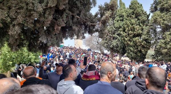 نمازگزاران روزهدار فلسطینی با شعار «بالروح بالدم نفدیک یا أقصى» (با جان و خونمان فدای تو میشویم)، بنرهایی را در حمایت از مقاومت در صحن مسجد نصب کردند.