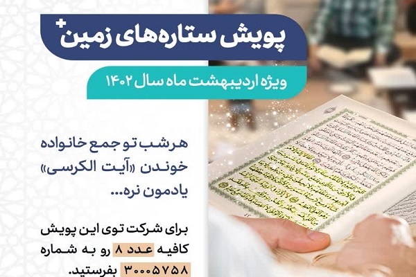 در این دوره از پویش باید هرشب در جمع خانواده «آیت الکرسی» را بخوانیم و قرائت روزانه آن را فراموش نکنیم. برای شرکت در این پویش نیز کافی است عدد ۸ را به شماره ۳۰۰۰۵۷۵۸ ارسال کنید.