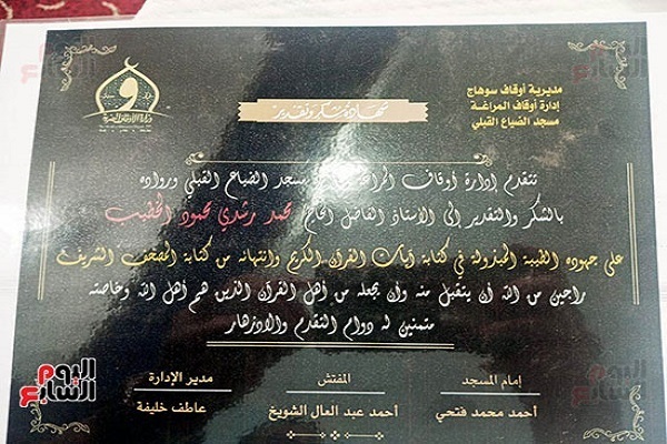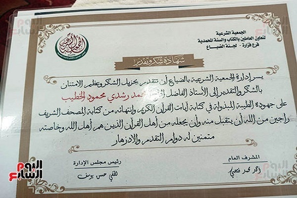 اداره اوقاف شهر مراغه به خاطر این قرآن او را تکریم کرده است و این معلم مصری برای نخستینبار پس از شفا از بیماری، سوره کهف را دستنویسی و سپس کل قرآن را کتابت کرد.