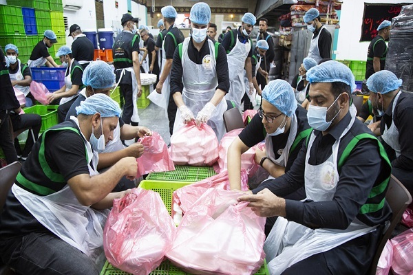 پخت، حمل و توزیع انواع پیش‌غذا، غذا و نوشیدنی‌های مختلف با رعایت معیارهای بهداشتی، بسته‌بندی آنها در ظروف یک‌بارمصرف که مورد تأیید وزارت بهداشت عراق قرار گرفته است و توزیع آن در میان زائران از مهم‌ترین این اقدامات به شمار می‌رود. همچنین پذیرایی از زائران اربعین حسینی در زائرسراها و مهمانسراهای آستان حسینی و همچنین آستان مقدس علوی در نجف از دیگر اقدامات این آستان محسوب می‌شود.