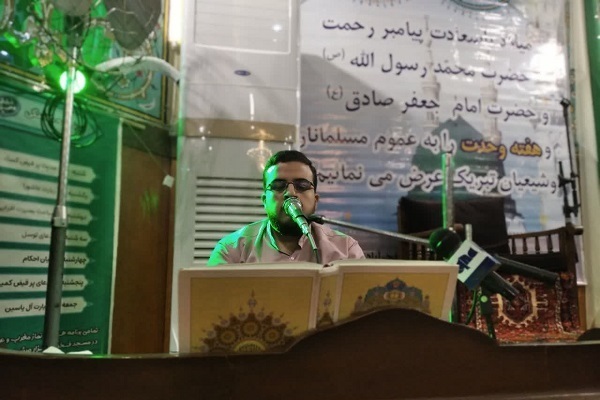 این گزارش حاکی است در ادامه احمد مرادی از قاریان پیشکسوت قرآن که قرار است طی هفته‌های آتی، دوشنبه‌شب‌ها در مسجد فخرآباد، محفل قرآنی اعم از آموزش و قرائت قرآن برای علاقه‌مندان برگزار کند، مدیریت جلسه شب گذشته را بر عهده گرفت و در مطلع جلسه با تبریک هفته وحدت و میلاد حضرت محمد(ص) و امام جعفر صادق(ع)، به تلاوت آیاتی از  سوره مبارکه «احزاب» پرداخت.