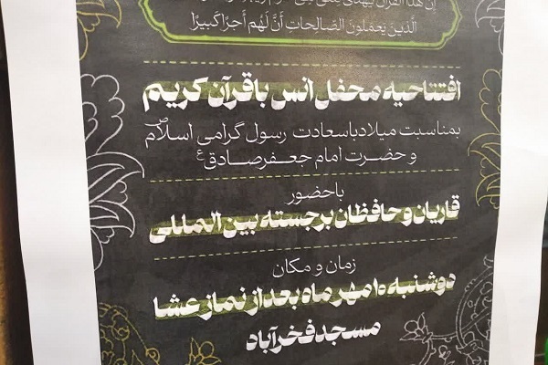 محفل قرآنی مسجد فخرآبادبه گزارش خبرنگار ایکنا، مسجد فخرآباد واقع در محله دروازه شمیران و میدان ابن‌سینای تهران، شب گذشته؛ دوشنبه 10 مهر و در آستانه سالروز میلاد باسعادت نبی مکرم اسلام؛ حضرت محمد(ص) و امام جعفر صادق(ع)، حال و هوای دیگری داشت، چرا که از روزها قبل نمازگزاران این مسجد برای برگزاری مراسم ویژه محفل انس با قرآن برای چنین شبی، وعده داده شده بودند و حال موعد آن رسیده بود که پس از اقامه نماز جماعت مغرب و عشا، شاهد این اتفاق باشند.