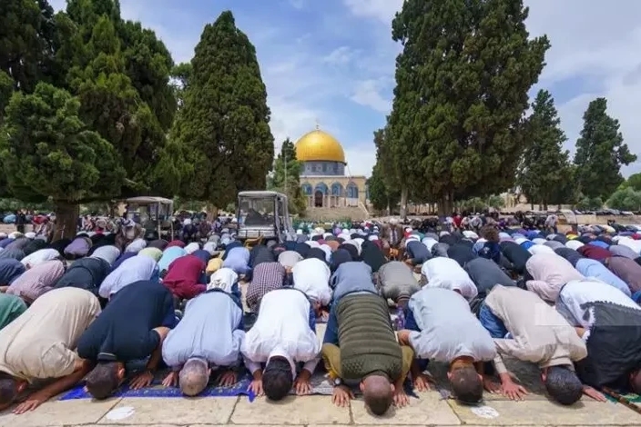 صحنهای مسجد الاقصی مملو از هزاران نمازگزار بود که از استانهای کرانه باختری از جمله قدس اشغالی و سرزمینهای 1948 آمده بودند.