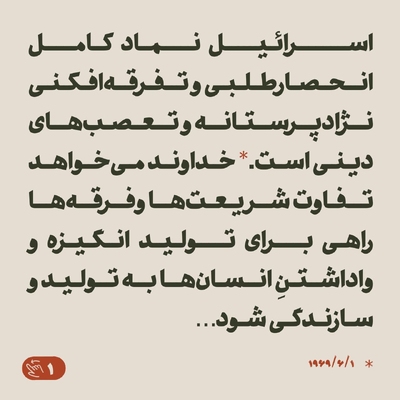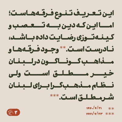 اسرائیل نماد کامل انحصارطلبی، تفرقهافکنی نژادپرستانه و تعصبهای دینی است. خداوند میخواهد تفاوت شریعتها و فرقهها راهی برای تولید انگیزه و واداشتن انسانها به تولید و سازندگی شود. این تعریف تنوع فرقههاست؛ اما اینکه دین به تعصب و کینهتوزی رضایت داده باشد، نادرست است. وجود فرقهها و مذاهب گوناگون در لبنان خیر مطلق است ولی نظام مذهبگرا برای لبنان شر مطلق است. رسالت ما در لبنان با رسالت اسرائیل در تضاد است. رسالت اسرائیل نژادپرستی، مذهبگرایی و رد همزیستی است و رسالت ما برای همگان همزیستی، گشودگی و بشردوستی مؤمنانه است. وجود ما نقیض وجود آنهاست. [امام موسی صدر]