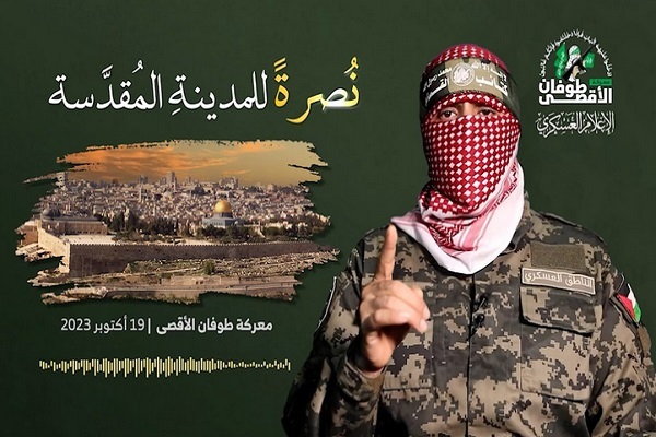 ابوعبیده طی یک سخنرانی صوتی گفت که جهان همچنان نظارهگر جنایات صهیونیستها در کشتار کودکان و غیرنظامیان و بمباران خانههای امن است و ما خواهان گسترش نبرد طوفان الاقصی به هر وجب از جایی هستیم که نگاهبانان مسجد الاقصی و نیروهای مقاومت هستند.