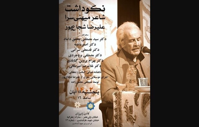 به گزارش ایکنا، مراسم نکوداشت علیرضا شجاعپور روز پنجشنبه، ۱۸ آبان ساعت ۱۶ در کانون زبان فارسی به نشانی خیابان ولیعصر، سهراه زعفرانیه، خیابان شهید عارفنسب، شماره ۱۲، باغ موقوفات دکتر محمود افشار برگزار میشود.