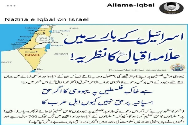 یکم: اقبال لاهوری در واپسین روزهای عمر خود در نامههایی خطاب به محمد علی جناح تصریح کرد که مشتاق است به دلیل تحقق آرمان سرزمین فلسطین به زندان برود. او که معضل اسرائیل را با پوست و گوشت خود لمس میکرد در شعری سرود: