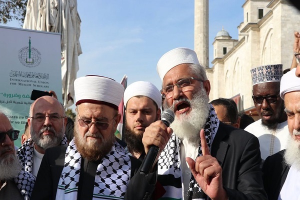 دبیرکل اتحادیه علمای مسلمان تأکید کرد: امروز میخواهیم صدایمان را به گوش جهانیان برسانیم و اعلام کنیم که در کنار برادران و خواهران خود در غزه هستیم و میگوییم که کمک به آنها واجب است. امروز میخواهیم این پیام را از مسجد فاتح، نماد فتح استانبول به تمام جهان فریاد بزنیم. مقاومت و مبارزه با متجاوزان در هر نقطه از جهان در حقوق بینالملل و در تمام متون دینی حق است. بر این اساس میگوییم جنبش حماس در فلسطین یک گروه مقاومت است که از سرزمین خود دفاع میکند.