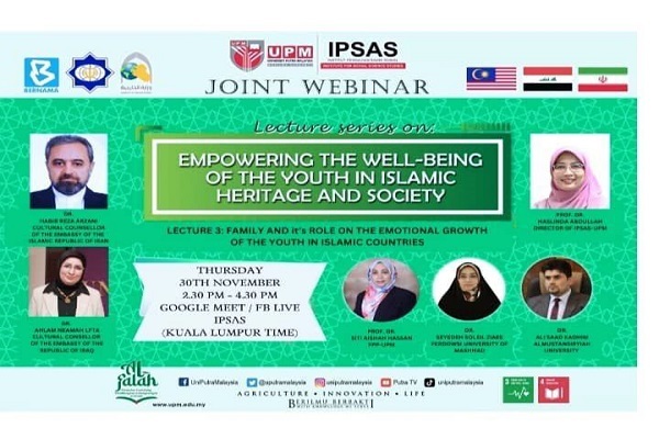 به گزارش ایکنا به نقل از رایزنی فرهنگی ایران در مالزی، سومین جلسه وبیناری از مجموعه وبینارهای بینالمللی توانمندسازی جوانان در جامعه اسلامی با موضوع «خانواده و نقش آن در رشد عاطفی جوانان در کشورهای مسلمان» از سوی دانشگاه UPM مالزی، رایزنی فرهنگی جمهوری اسلامی ایران در مالزی و مرکز فرهنگی عراق در این کشور برگزار خواهد شد.