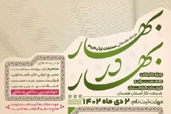 به گزارش ایکنا، آخرین مهلت شرکت در مرحله مقدماتی پانزدهمین دوره مسابقات قرآن «بهار در بهار» ویژه کارکنان و همسران شرکت ملی گاز ایران تا دوم دیماه ۱۴۰۲ است.