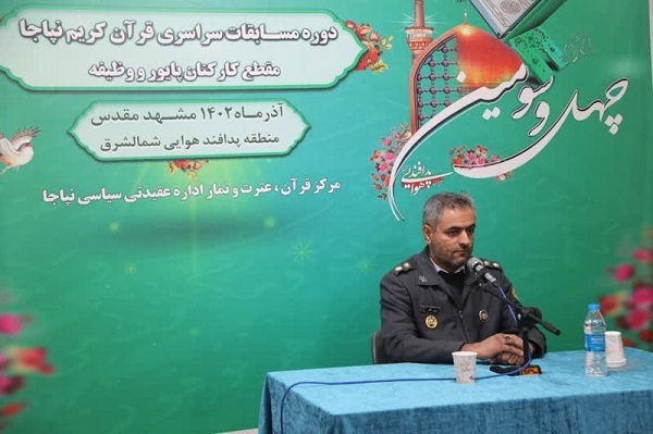 رقابت قرآنی کارکنان پایور و وظیفه پدافند هوایی ارتش امروز پایان می‌یابدبه گزارش ایکنا، آیین اختتامیه چهل و سومین دوره مسابقات نهایی قرآن کریم ویژه کارکنان پایور و وظیفه نیروی پدافند هوایی ارتش صبح امروز با حضور امیر سرتیپ محمد یوسفی خوش‌قلب، معاون هماهنگ‌کننده نیروی پدافند هوایی ارتش، حجت‌الاسلام والمسلمین روشندل، رئیس اداره عقیدتی ـ سیاسی نیروی پدافند هوایی ارتش، سرهنگ میدانی، رئیس اداره قرآن، عترت و نماز سازمان عقیدتی ـ سیاسی ارتش و جمعی از مسئولان کشوری و لشکری در سالن سینما قدس منطقه پدافند هوایی شمال شرق امام رضا(ع) برگزار شد.