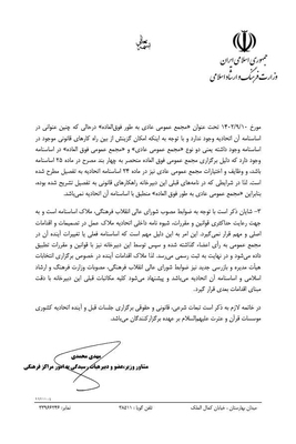 شایان ذکر است با توجه به ضوابط مصوب شورای عالی انقلاب فرهنگی ملاک اساسنامه است و به جهت رعایت حداکثری قوانین و مقررات شیوهنامه داخلی اتحادیه ملاک عمل در تصمیمات و اقدامات اصلی و مهم قرار نمیگیرد. این امر به این دلیل مهم است که اساسنامه فعلی یا تغییرات آینده آن در مجمع عمومی به رای اعضا گذاشته شده و سپس توسط این دبیرخانه نیز با قوانین ومقررات تطبیق داده میشود و در نهایت به ثبت رسمی میرسد. لذا ملاک اقدامات آینده در خصوص برگزاری انتخابات هیئت مدیره و بازرسی جدید نیز ضوابط شورای عالی انقلاب فرهنگی مصوبات وزارت فرهنگ و ارشاد اسلامی و اساسنامه آن اتحادیه میباشد و پیشنهاد میشود تمامی مکاتبات قبلی این دبیرخانه با دقت مبنای اقدامات بعدی قرار گیرد.