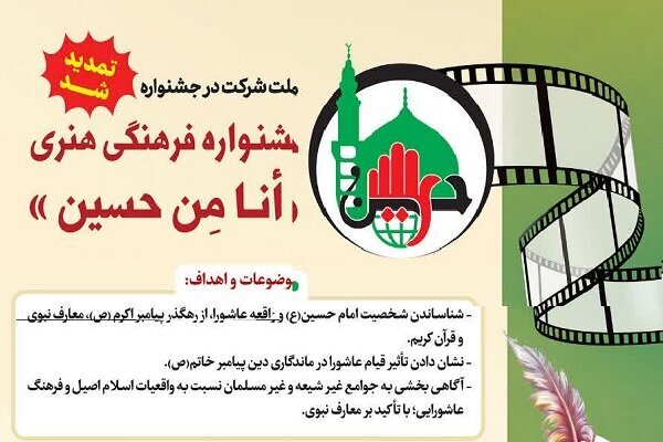 جشنواره فرهنگی هنری اهلبیت(ع) که در دوره دوم خود با نام «أنا مِن حسین» فراخوان شد، با دو موضوع تخصصی «معرفی امام حسین(ع) و قیام عاشورا به غیر شیعیان» و «ارتباط امام حسین(ع) با پیامبر اکرم(ص)» و زیر موضوعات آنها در پنج بخش فراخوان شد.