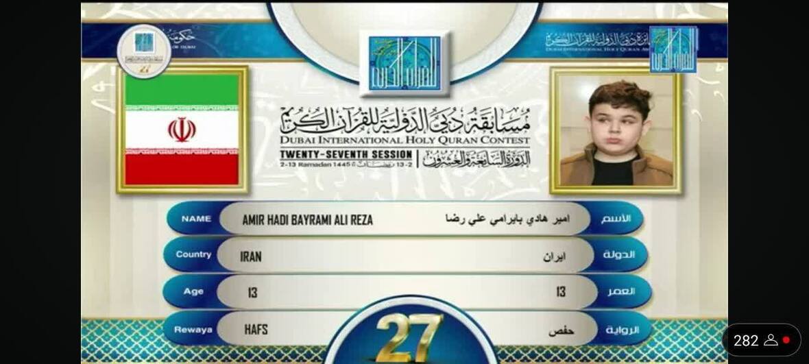 نماینده کشورمان در مسابقات بین‌المللی قرآن کشور امارات روز گذشته در رشته حفظ کل قرآن کریم به سوالات هیئت داوران در این رویداد پاسخ داد و هیچ تذکری از سوی گروه داوری دریافت نکرد.