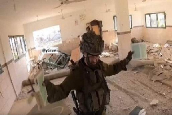 این ویدئو که از سوی نیروهای متجاوز اسرائیلی ضبط و منتشر شده، یک نظامی صهیونیست را نشان میدهد که قرآن کریم را پاره میکند و کف مسجدی ویران شده میاندازد.