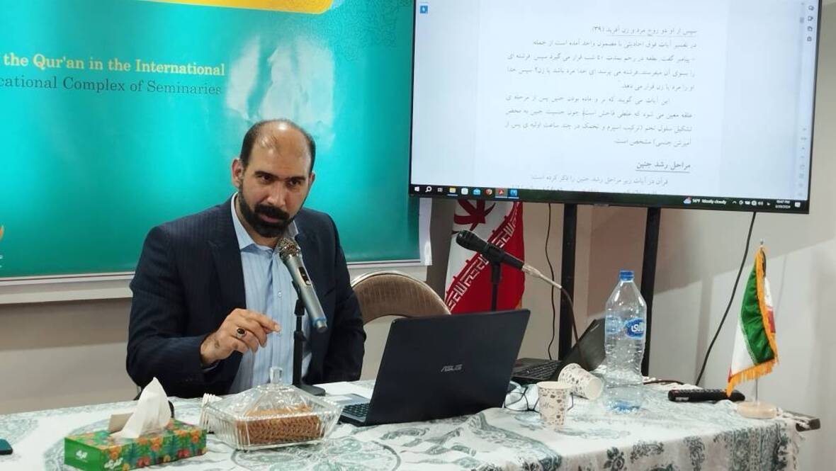 رضایی در این نشست با اشاره به آیات 37 تا 39 سوره مبارکه قیامت که در ارتباط با مراحل رشد جنین و تعیین جنسیت است، شبهات مطرح شده در کتاب نقد قرآن کریم سها را در این رابطه مطرح کرده و با بررسی لغات به کار رفته در این آیات و همچنین با اشاره به آیه ۴۵ و ۴۶ سوره مبارکه نجم به پاسخگويی پیرامون این شبهه پرداخت.