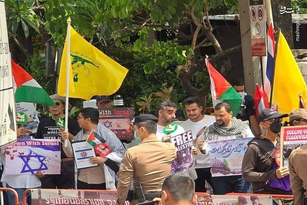 به گزارش ایکنا از تایلند، راهپیمایی و تجمع روز قدس در مقابل سفارت رژیم صهیونیستی در بانکوک برگزار شد. تظاهرکنندگان در این تجمع، جنایات رژیم صهیونیستی را محکوم کردند.