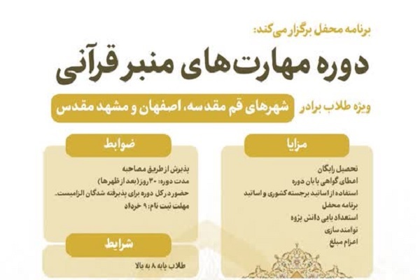 به گزارش ایکنا، دوره مهارتهای منبر قرآنی ویژه طلاب شهرهای قم، اصفهان و مشهد مقدس به همت برنامه قرآنی محفل برگزار میشود.