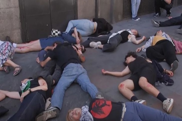 این فعالان اسپانیایی با استفاده از چفیه و نمادهای فلسطینی، با دراز کشیدن روی خیابان و پاشیدن رنگ قرمز به بدن خود، جنایات رژیم صهیونیستی در جنگ غزه را شبیهسازی کردند.