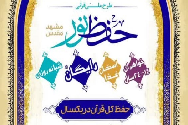 طرح حفظ یکساله شبانهروزی کل قرآن کریم به صورت رایگان و در جوار بارگاه ملکوتی حضرت علی ابن موسی الرضا(ع) انجام میشود.