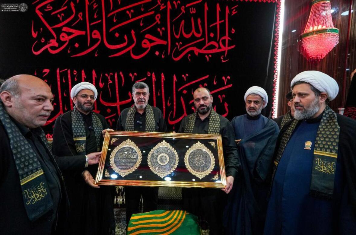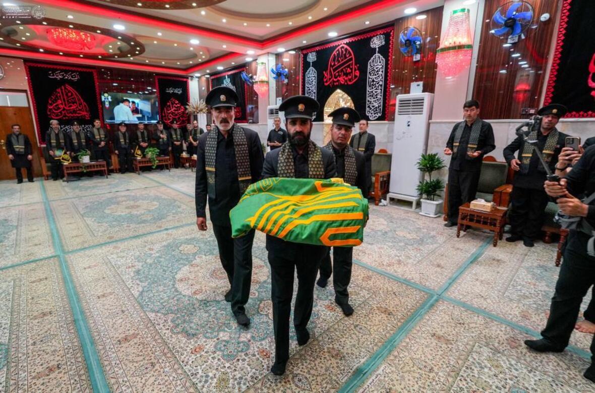 عمار العباسی، عضو هیئت مدیره آستان مقدس علوی در حین استقبال از هیئتی از آستان قدس پرچم متبرک حرم رضوی را دریافت کرد.