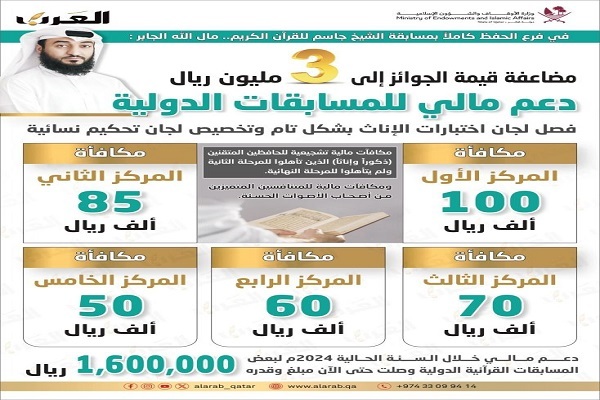 به گزارش ایکنا به نقل از حال الخلیج، وزارت اوقاف و امور اسلامی قطر از تغییر بنیادین در مسابقات قرآن کریم شیخ جاسم بن محمد بن ثانی شامل جداسازی کمیتههای داوری و آزمون زنان، دو برابر شدن تعداد برندگان و ارزش جوایز مالی این مسابقات خبر داد.