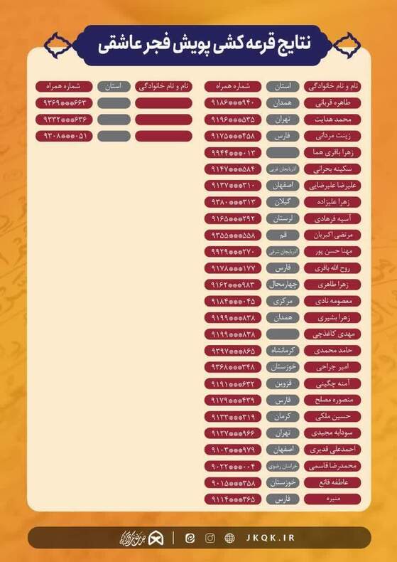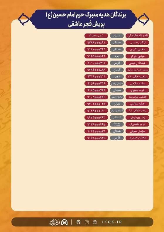 با پایان این پویش، اسامی برندگان این پویش شامل 128 برنده سفر به مشهد مقدس و 114 برنده هدیه متبرک حرم امام حسین(ع) پس از قرعهکشی اعلام شد.
