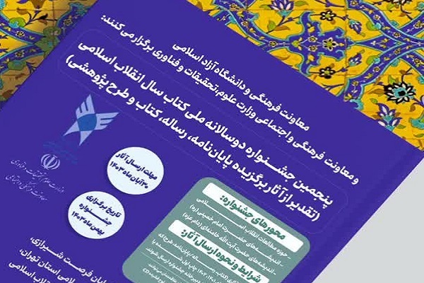 به گزارش ایکنا، پنجمین جشنواره دوسالانه ملی کتاب سال انقلاب اسلامی با هدف تقدیر از آثار برگزیده پایاننامه، رساله، کتاب و طرح پژوهشی به همت معاونت فرهنگی و دانشجویی دانشگاه آزاد اسلامی و معاونت فرهنگی و اجتماعی وزارت علوم، تحقیقات و فناوری برگزار میشود.