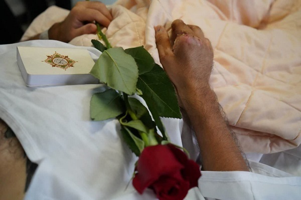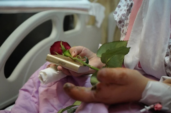 همچنین به جانبازان و کادر درمان بیمارستان، یک جلد قرآن و شاخه گل اهدا شد.