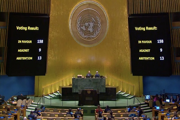 این قعطنامه ۱۵۸ رأی موافق، ۹ رأی مخالف و ۱۳ رأی ممتنع کسب کرد. ایالات متحده آمریکا و رژیم صهیونیستی از جمله مخالفان تصویب این قطعنامه در مجمع عمومی سازمان ملل بودند.