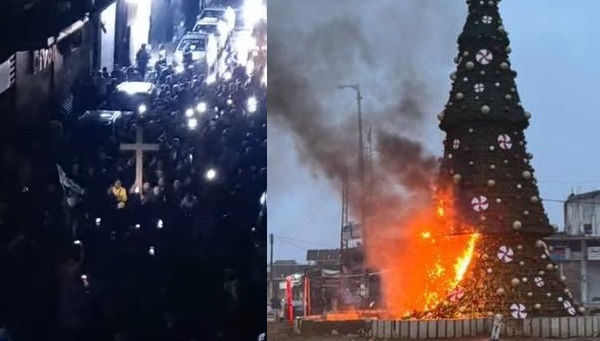 ساعاتی پیش از این تظاهرات، ویدئویی در شبکههای اجتماعی منتشر شد که چند تن از شورشیان را در حال آتش زدن درخت کریسمس در شهر مسیحینشین «سقيلبيه» در نزدیکی حماه نشان میداد.