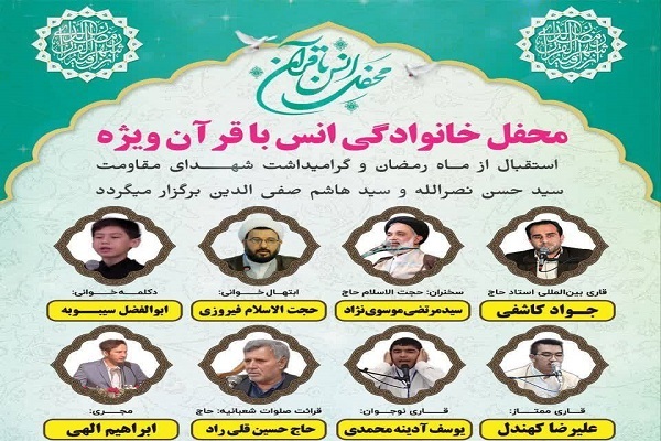 به گزارش ایکنا، محفل انس با قرآن بهمناسبت استقبال از ماه مبارک رمضان و گرامیداشت شهدای مقاومت با تلاوت جواد کاشفی، نفر اول مسابقات بینالمللی جمهوری اسلامی ایران و همچنین تلاوت دیگر قاریان ممتاز همچون علیرضا کهندل و یوسف آدینهمحمدی و با اجرای ابراهیم الهی برگزار خواهد شد.