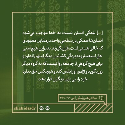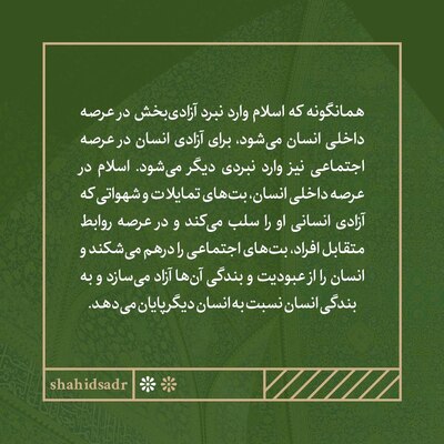 همان‏گونه كه اسلام وارد نبرد آزادی‌بخش در عرصه داخلى انسان می‌شود، براى آزادى انسان در عرصه اجتماعى نيز وارد نبردى ديگر می‌شود. اسلام در عرصه داخلى انسان، بت‌های تمايلات و شهواتى كه آزادى انسانى او را سلب می‌كند و در عرصه روابط متقابل افراد، بت‌هاى اجتماعى را درهم می‌شكند و انسان را از عبوديت و بندگى آن‌ها آزاد می‌سازد و به بندگى انسان نسبت به انسان ديگر پايان می‌دهد. [...] بندگى انسان نسبت به خدا موجب می‌شود انسان‌ها همگى در سطحى واحد در مقابل معبودى كه خالق هستى است، قرار بگيرند. بنابراين هيچ امتى حق استعمار و به بردگی كشاندن ديگر امت‌ها را ندارد. [شهید محمدباقر صدر، کتاب اسلام راهبر زندگی، ص۳۶۰-۳۶۱]