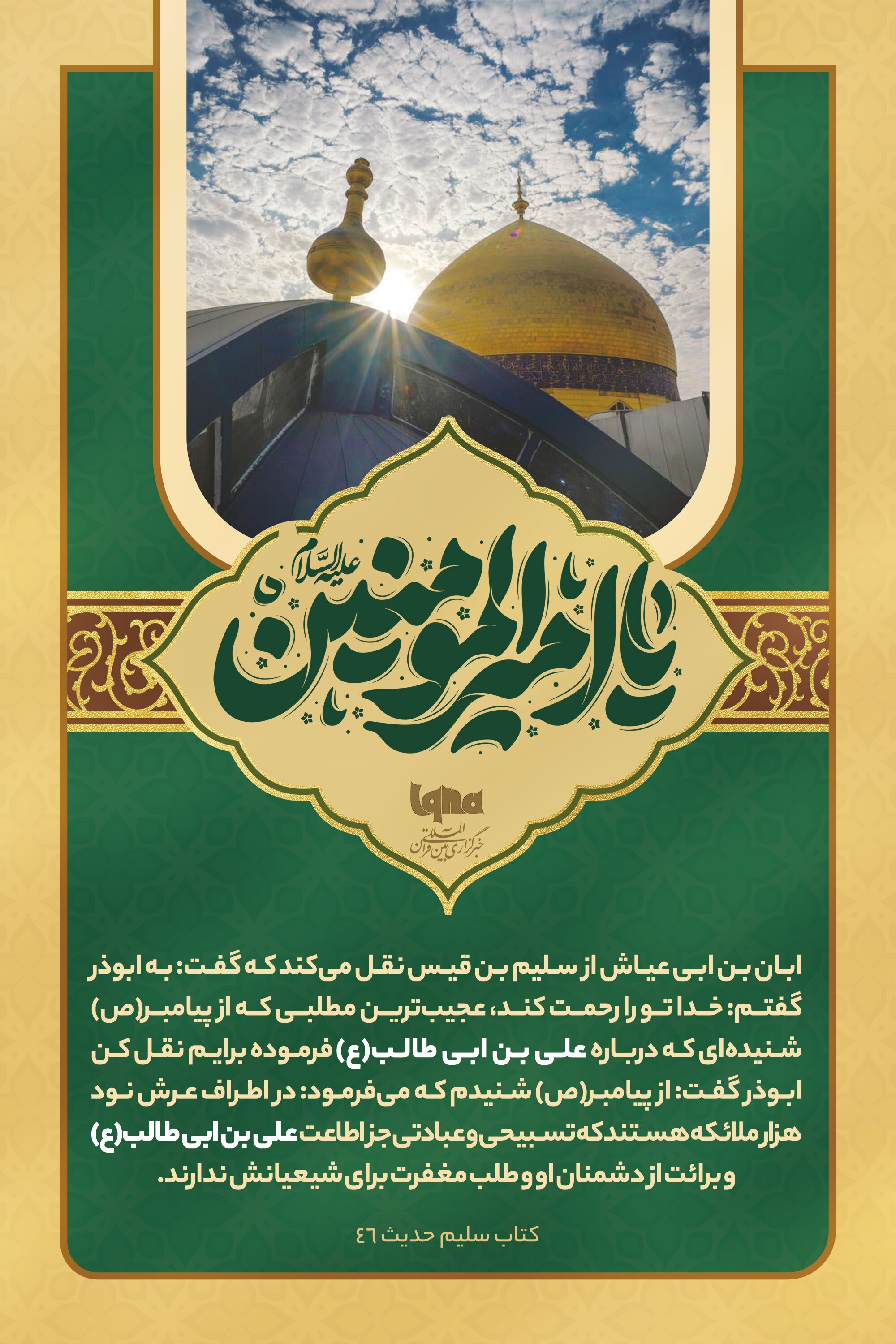 ابان بن ابی عیاش از سلیم بن قیس نقل میکند که گفت: به ابوذر گفتم: خدا تو را رحمت کند، عجیبترین مطلبی که از پیامبر(ص) شنیدهای که درباره علی بن ابی طالب(ع) فرموده برایم نقل کن. ابوذر گفت: از پیامبر(ص) شنیدم که میفرمود: در اطراف عرش نود هزار ملائکه هستند که تسبیحی و عبادتی جز اطاعت علی بن ابی طالب(ع) و برائت از دشمنان او و طلب مغفرت برای شیعیانش ندارند. [کتاب سلیم، حدیث ۴۶]