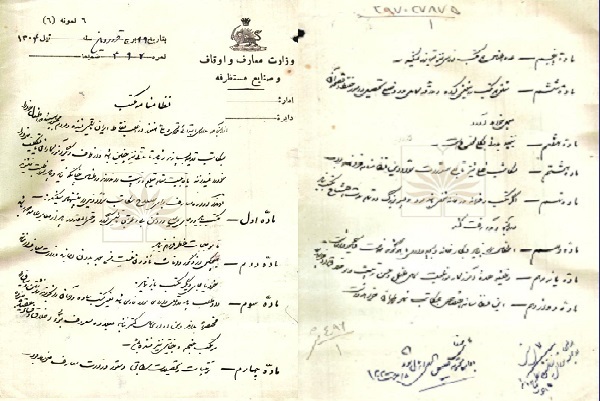 در یازدهمین شماره، «نظامنامه مکتب‌خانه‌ها» متعلق به اواخر دوره قاجار معرفی می‌شود؛ متنی که در بیستمین جلسه شورای عالی معارف در تاریخ ۲۷ بهمن ۱۳۰۳ تصویب و در ۲۹ فروردین ۱۳۰۴ ویژه شهر تهران بر کاغذ رسمی وزارت معارف، اوقاف و صنایع مستظرفه به خط نستعلیق خوش‌نویسی و ابلاغ شد.