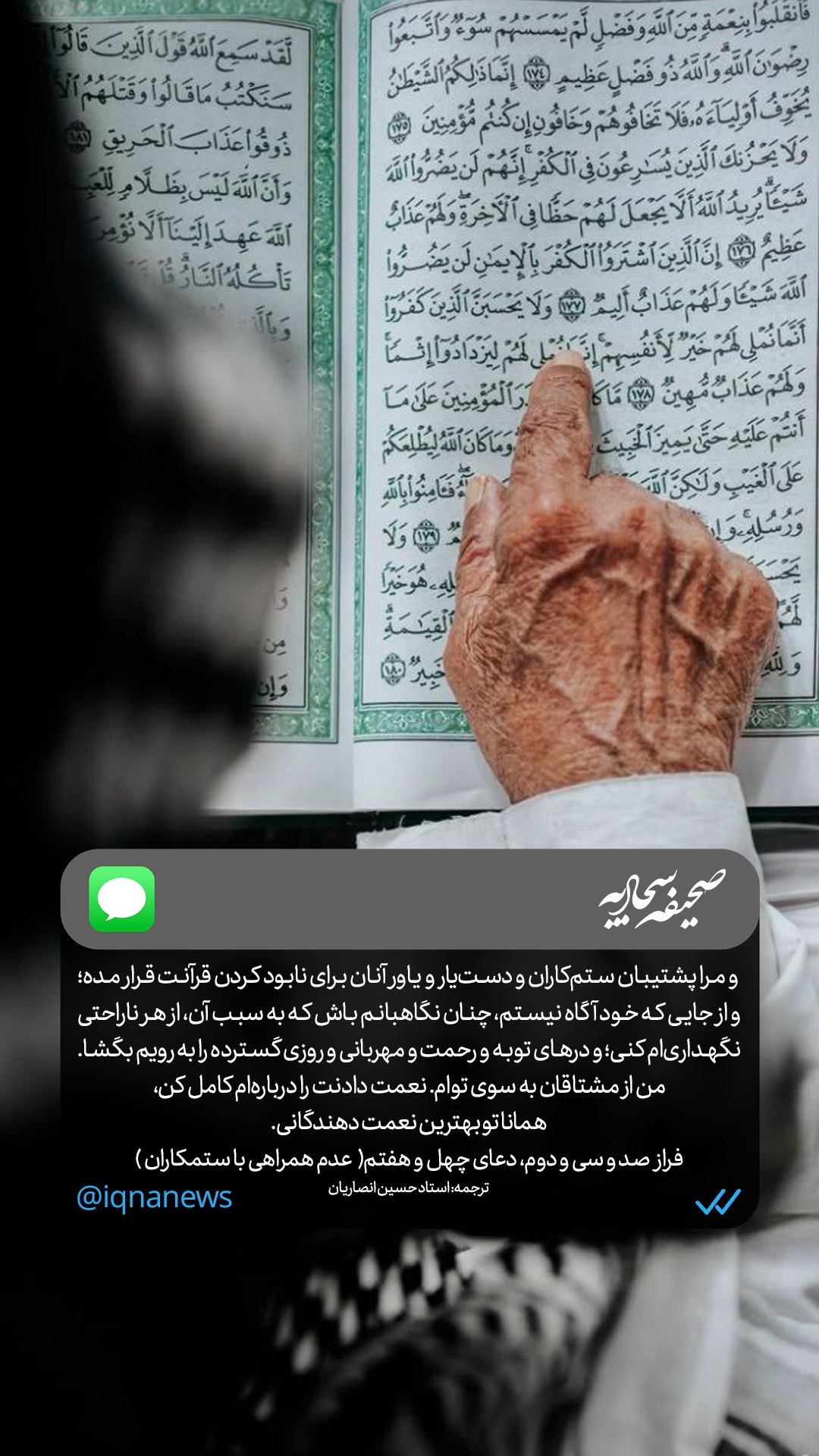 «از جایی که خود آگاه نیستم، چنان نگاهبانم باش که به سبب آن، از هر ناراحتی نگهداری‌ام کنی». صحیفه سجادیه، مرواریدی درخشان در دریای ادب و عرفان اسلامی است. این کتاب ارزشمند، مجموعه‌ای از دعاها و مناجات امام سجاد(ع) است که قلب‌های مشتاق را به سوی معبود می‌کشاند. هر برگ از این صحیفه، آینه‌ای است که جمال الهی را به تصویر می‌کشد و روح را صیقل می‌دهد و انسان را به سوی کمال و رستگاری هدایت می‌کند. ایکنا به منظور کاربرد عملی این اثر ادبی و هنری در زندگی، بخش‌هایی از دعاهای صحیفه سجادیه را در قالب تصویر منتشر می‌کند و مخاطبان را به دنیایی از معنا و معرفت می‌برد.