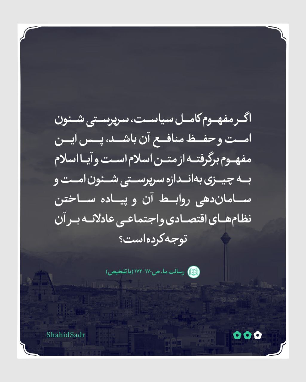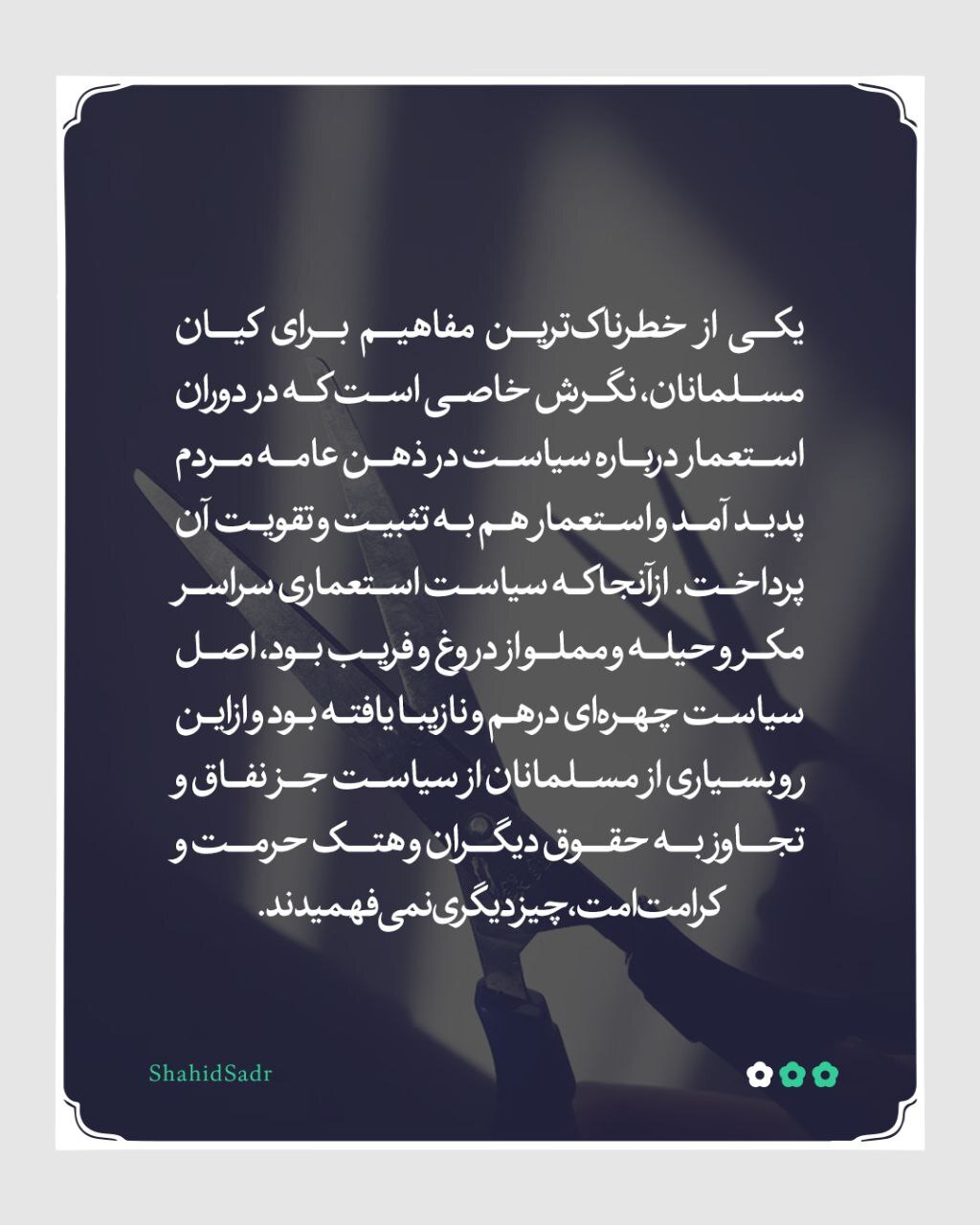 ازآنجاکه سیاست استعماری سراسر مکر و حیله و مملو از دروغ و فریب بود، اصل سیاست چهرهای درهم و نازیبا یافته بود و از اینرو بسیاری از مسلمانان از سیاست جز نفاق و تجاوز به حقوق دیگران و هتک حرمت و کرامت امت، چیز دیگری نمیفهمیدند. تثبیت این ذهنیت در افکار امت، اندیشه جدایی سیاست از اسلام را پدید آورد و پس از آن مردم به سیاست بهگونهای مینگریستند که گویی سیاست دورترین مفهوم از واقعیت و گوهر اسلام است. اگر مفهوم کامل سیاست، سرپرستی شئون امت و حفظ منافع آن باشد، پس این مفهوم برگرفته از متن اسلام است و آیا اسلام به چیزی بهاندازه سرپرستی شئون امت و ساماندهی روابط آن و پیاده ساختن نظامهای اقتصادی و اجتماعی عادلانه بر آن توجه کرده است؟ [شهید سید محمدباقر صدر، کتاب رسالت ما، ص١٧٠-١٧٢]