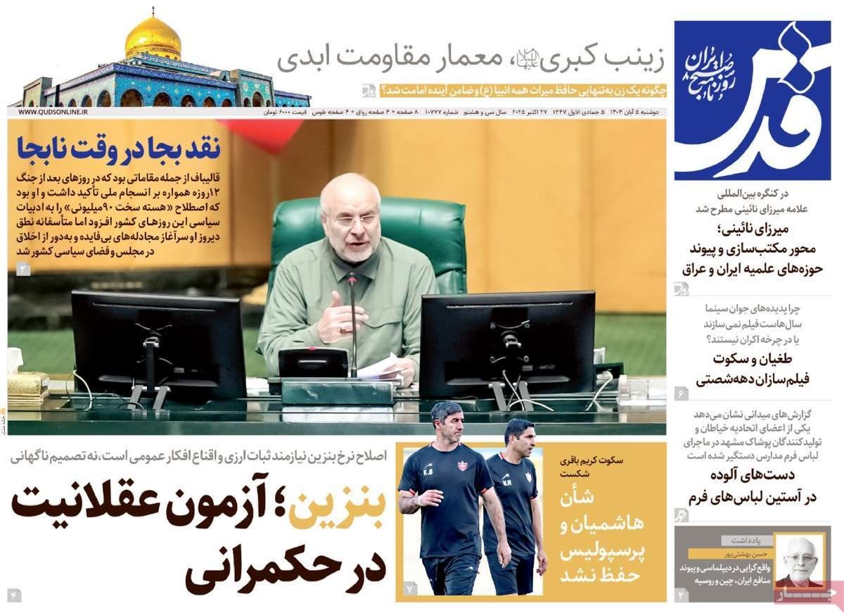 صفحه نخست روزنامههای دوشنبه ۵ آبان ۱۴۰۴ را که به تلاوتهای جهانی روی آنتن ملی، جدال بر سر روسیه، ازدواج در مسیر اعتباری شدن، ادامه اصلاح بانکهای ناتراز و مهمترین رویدادهای ورزشی پرداختهاند؛ در ادامه مشاهده میکنید.