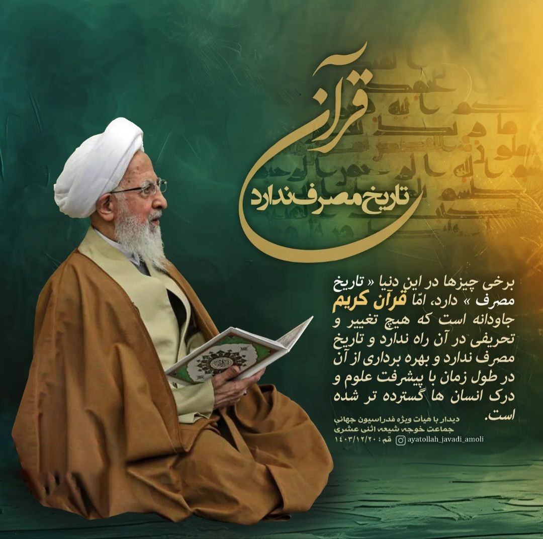 برخی چیز‌ها در این دنیا «تاریخ مصرف» دارد، اما قرآن کریم جاودانه است که هیچ تغییر و تحریفی در آن راه ندارد و تاریخ مصرف ندارد و بهره‌برداری از آن در طول زمان با پیشرفت علوم و درک انسان‌ها گسترده‌تر شده است. [آیت‌الله جوادی آملی؛ ١٤٠٣/١٢/٢٠]