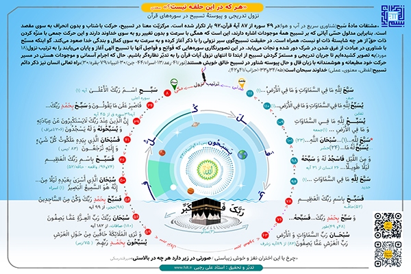 در این تصویرنگاری سورههایی که فَواتِح و فَواصِل آنها با تسبیح الهی آغاز و پایان مییابند، به ترتیب نزول (18 مورد) به تصویر کشیدهایم تا جریان تدریجی و مستمر گردش تسبیح از ابتدا تا انتهای نزول آیات قرآن را به تدبر نظارهگر باشیم. حال که اجرام آسمانی و موجودات هستی در مسیر حرکت خود مطیعانه و هوشمندانه با زبان قال و حال پیوسته شناور در تسبیح خالق خویش هستند (نور/ 41- رعد/ 13- اسراء/44 - جن/ 30 - انبیاء/ 79 - بقره/30)، راه تعالی انسان نیز ذکر دائم تسبیح (لفظی، معنوی، عملی) خداوند سبحان است. (طه/34و33 - احزاب/41و42).»