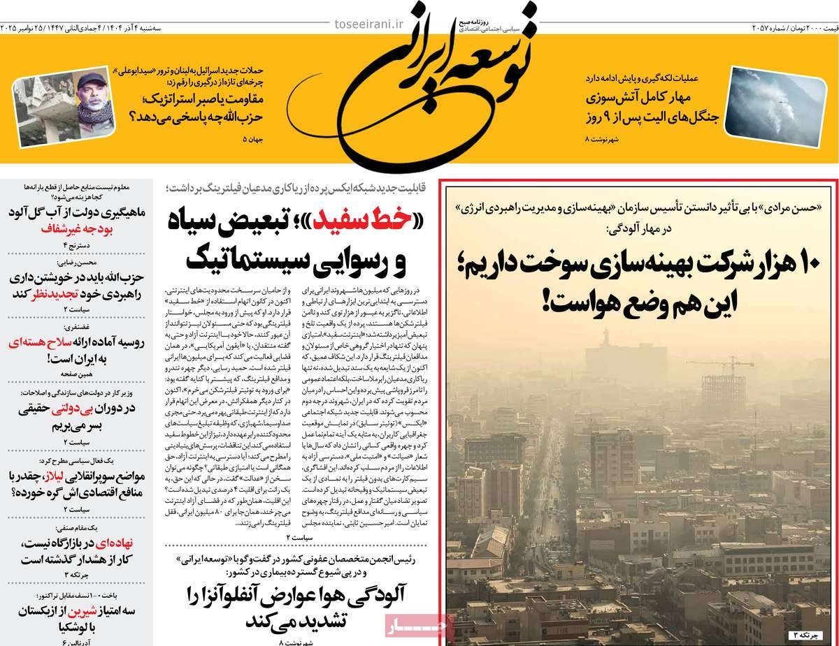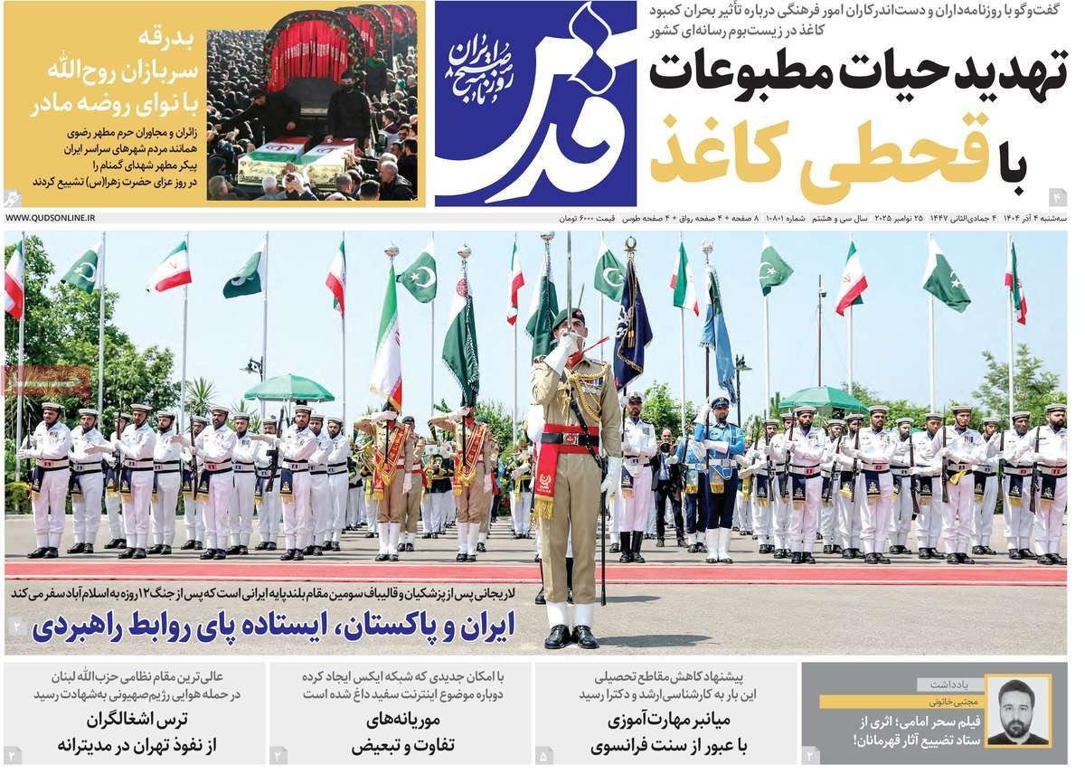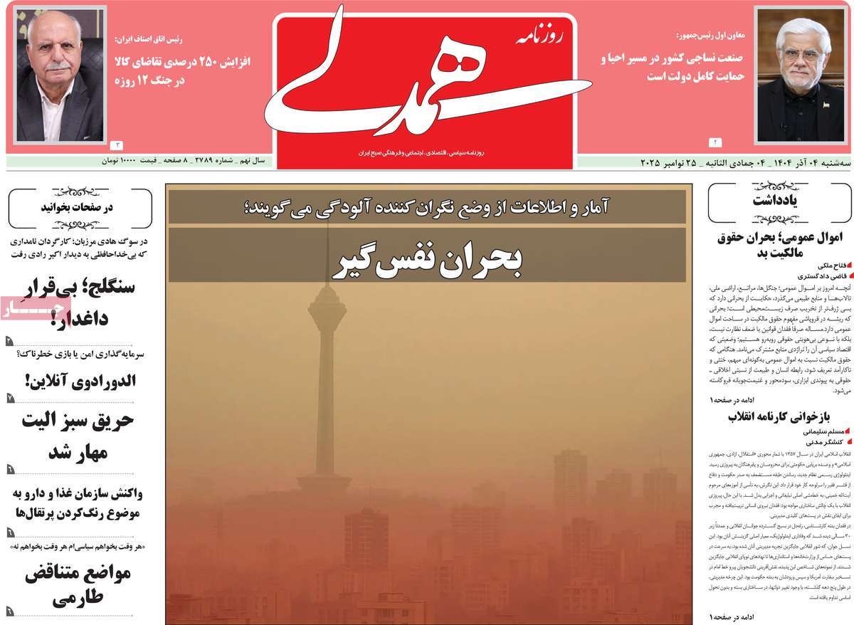 صفحه نخست روزنامههای سهشنبه ۴ آذر ۱۴۰۴ را که به کلانشهرها زیر گنبد دود، بیعت فاطمی با شهدا، دادخواهی در لاهه و مهمترین رویدادهای ورزشی پرداختهاند؛ در ادامه مشاهده میکنید.