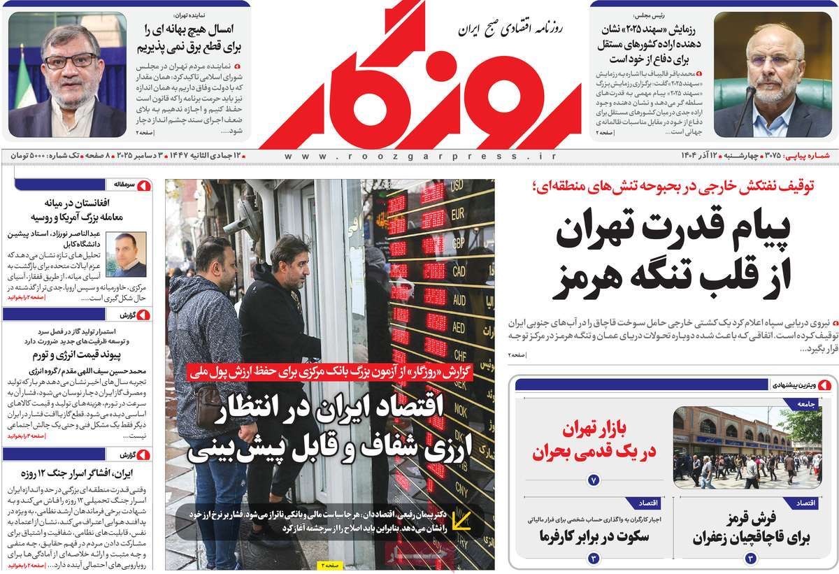 صفحه نخست روزنامههای چهارشنبه ۱۲ آذر ۱۴۰۴ را که به فیلترینگ تهدیدکننده امنیت ایران، الگوی موفق اصلاحات انرژی، بازار ارز در آتش بیاعتمادی و مهمترین رویدادهای ورزشی پرداختهاند؛ در ادامه مشاهده میکنید.