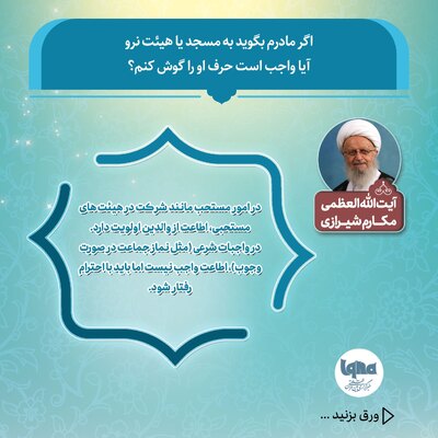گاهی پیش میآید که پدر یا مادر از رفتن فرزند به مسجد، هیئت یا مجالس مذهبی جلوگیری میکنند. مراجع تقلید میفرمایند «شرکت در مسجد و هیئت مستحب است، اما رنجاندن پدر و مادر حرام میباشد؛ بنابراین اگر رفتن سبب ناراحتی جدیِ والدین شود، اطاعت از آنان واجب و ترک مستحب لازم است». البته اگر والدین تنها از روی سختگیری یا بدون دلیل شرعی منع کنند و ناراحتی آنها جدی و آزاردهنده نباشد، رفتن اشکالی ندارد. در نگاه فقها، حفظ احترام والدین بر بسیاری از مستحبات مقدّم است. در ادامه نظر برخی مراجع را در این باره مشاهده میکنید.