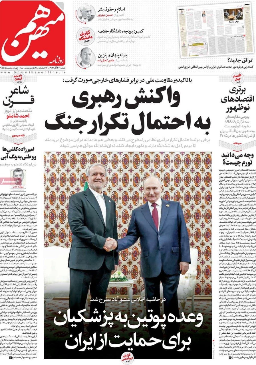 صفحه نخست روزنامههای شنبه ۲۲ آذر ۱۴۰۴ را که به نقشه راه آرایش رسانهای از سوی رهبر انقلاب، بانوان ستون توسعه پایدار، وعده روسیه برای حمایت از ایران و مهمترین رویدادهای ورزشی پرداختهاند؛ در ادامه مشاهده میکنید.