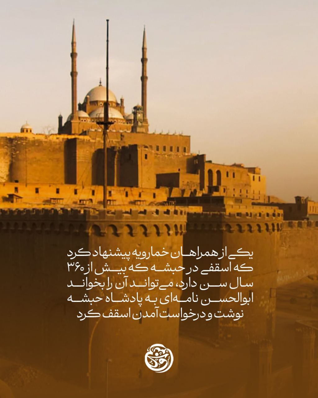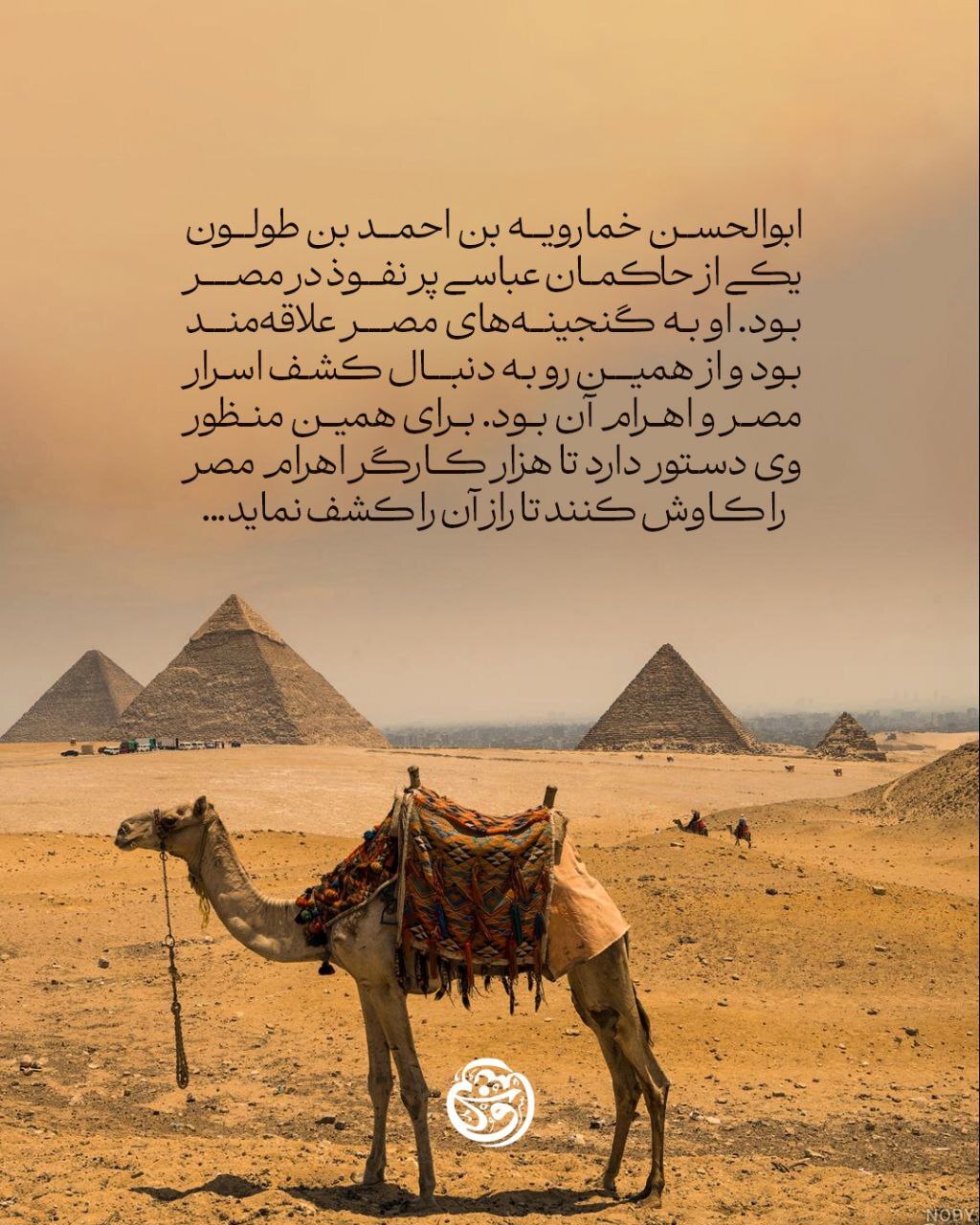 ابوالحسن خمارویه بن احمد بن طولون از حاکمان عباسی دستور داد تا هزار کارگر اهرام مصر را کاوش کنند تا راز آن را کشف نماید. در یکی از کاوشهای انجام گرفته دستهای از سنگها و کتیبهها کشف شد. در میان آنها، یک سنگ مرمر خاص گزارش شده است که روی آن نوشتهای به زبان یونانی بود. ابوالحسن خمارویه، پس از اطلاع از آنچه بر لوح بود و با توجه به تلاش یکسالهاش برای کشف اسرار اهرام، در عبارتی عجیب میگوید: برای این امر مهم راه حلی وجود ندارد جز به دست قائم آل محمد(عج)؛ او سپس دستور داد تا سنگ مرمر دوباره به جای خود باز گردانده شد.