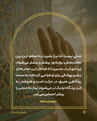 شکی نیست که نیاز بشریت به اسلام، این دین نجاتبخش، روزبهروز بیشتر و بیشتر میشود. زیرا جهان در مسیری که طراحان این تمدنهای بشری پوشالی برای او طراحی کردهاند، بهسمت پرتگاهی عمیق، در حرکت است و هرچقدر به این پرتگاه نزدیکتر میشود، نیاز به منجی را بیشتر احساس میکند. [شهید سید محمدباقر صدر، کتاب حوزه و بایستهها، ص۴۶]