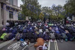 Des musulmans britanniques prient devant l'ambassade de France à Londres en protestation contre l'islamophobie